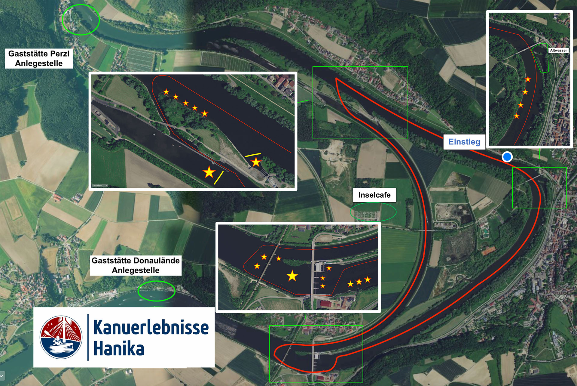 Der Rundkurs beginnt in der Donau Nähe Fußgängerbrücke Bad Abbach. Stromabwärts geht es in Richtung Oberndorf. Über die Sportbootschleuse wird bequem in den Kanal übergesetzt. Von dort paddelt man in Richtung Poikam unter beide Brücken hindurch und in einem großen Bogen um das Wasserwerk herum. Über die Kanutreppe setzt man wieder in die Donau über. Anschließend kann man sich von der Strömung gemütlich treiben lassen und beobachtet die Natur.